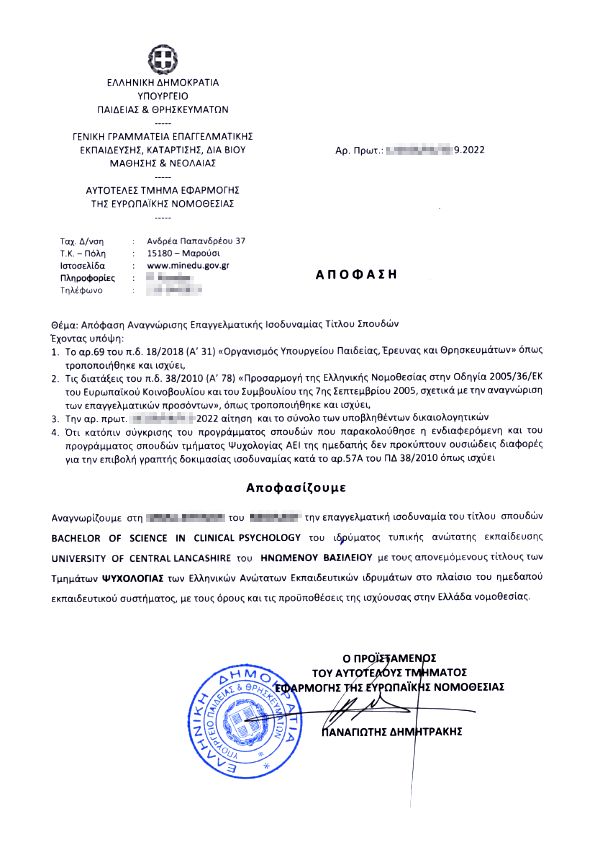 - Αναγνωρισμένο από το Αυτοτελές Τμήμα Εφαρμογής της Ευρωπαϊκής Νομοθεσίας (ΑΤΕΕΝ) (πρώην ΣΑΕΠ) ως Ισοδύναμο (Επαγγελματική Ισοδυναμία) των πτυχίων Ψυχολογίας των δημοσίων ΑΕΙ.