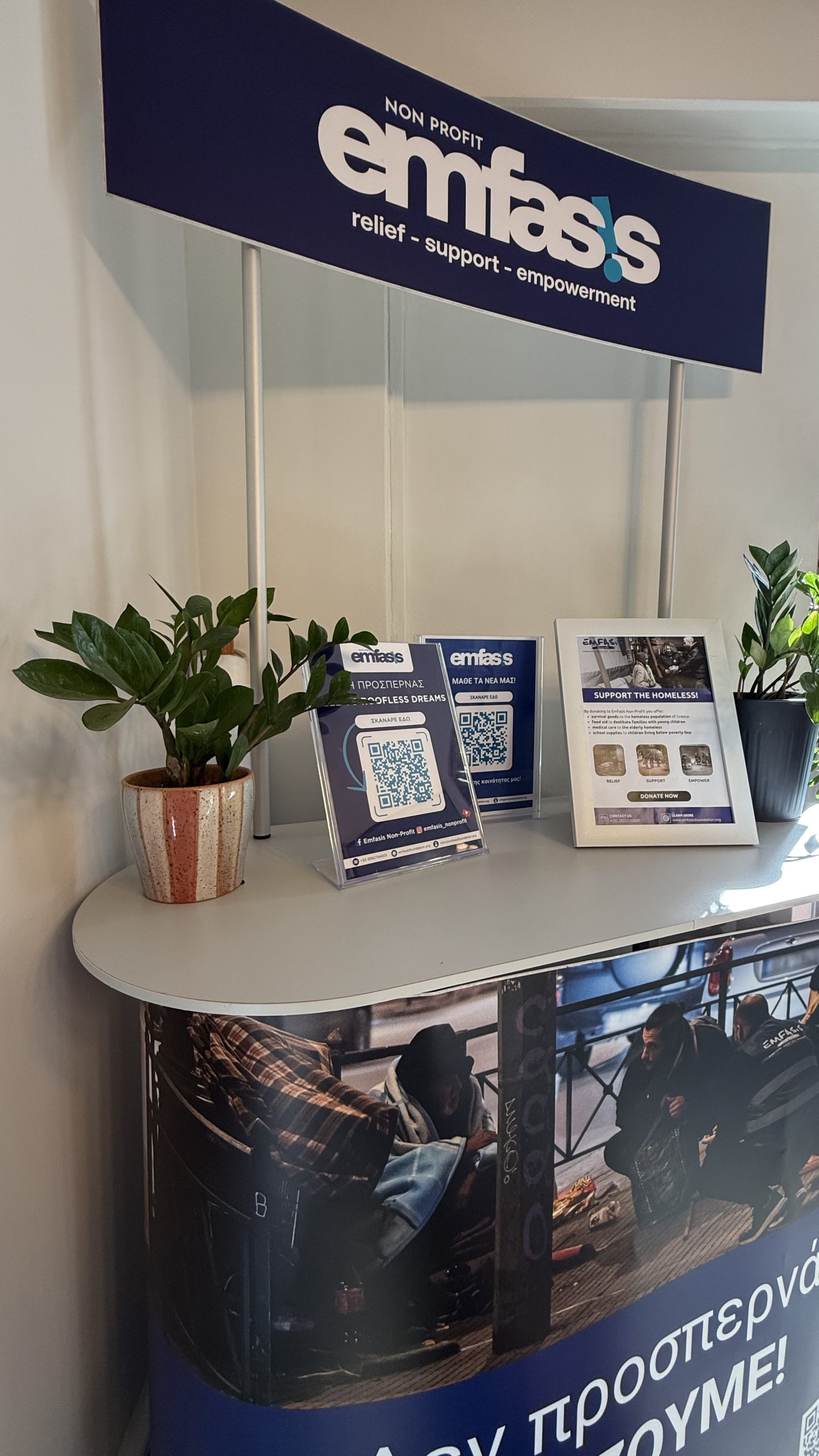 Από το 2013, η Emfasis Non-Profit, μια ανεξάρτητη και μη κερδοσκοπική πρωτοβουλία, υπερασπίζεται το δικαίωμα στην αξιοπρέπεια και προσφέρει άμεση ανακούφιση σε όσους βιώνουν ή απειλούνται από την αστεγία και τον κοινωνικό αποκλεισμό.