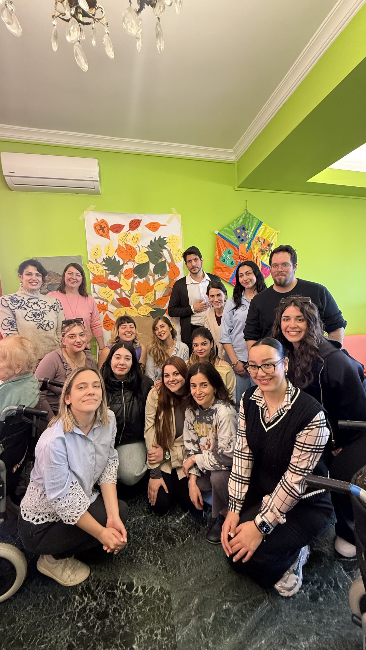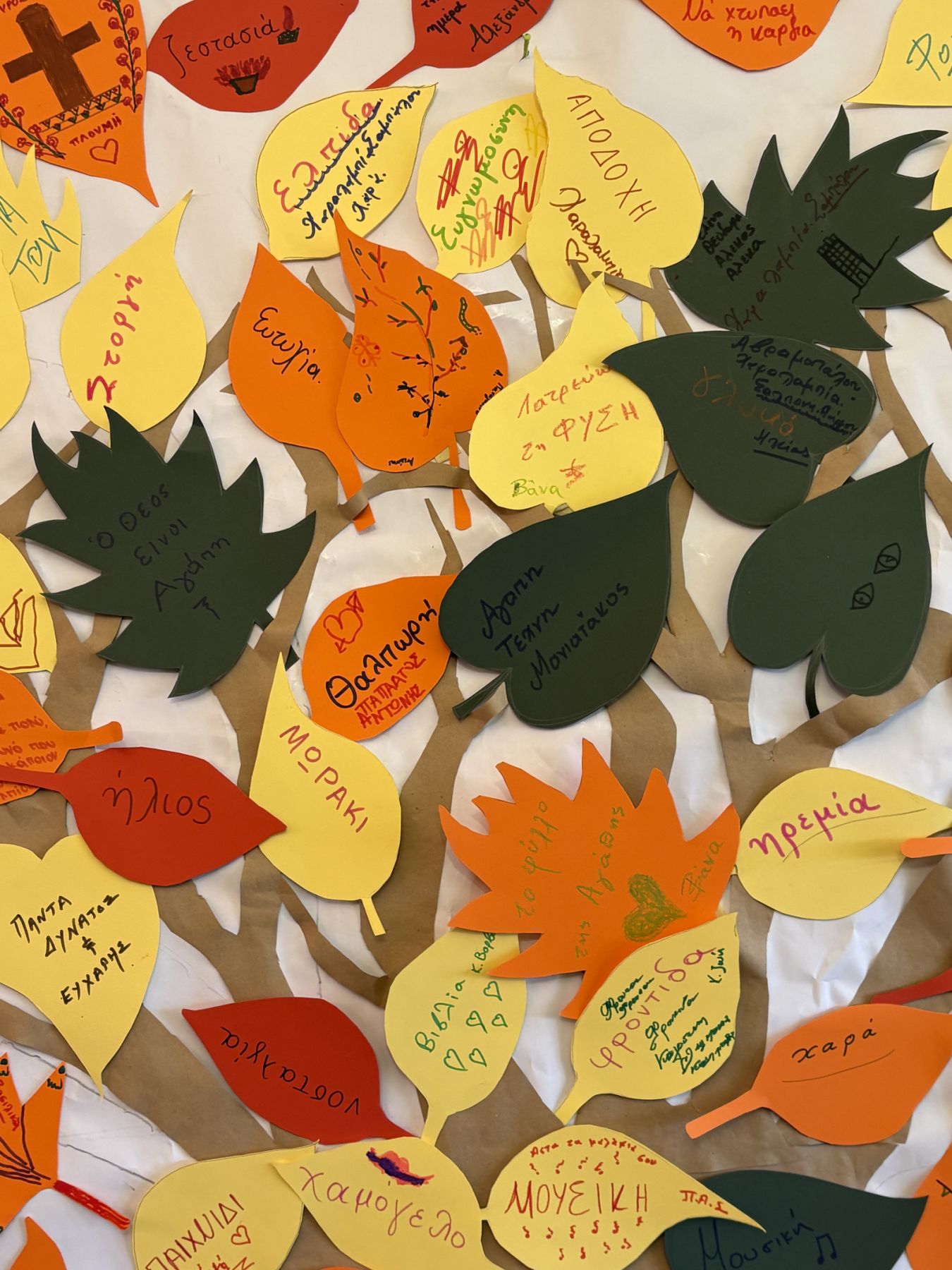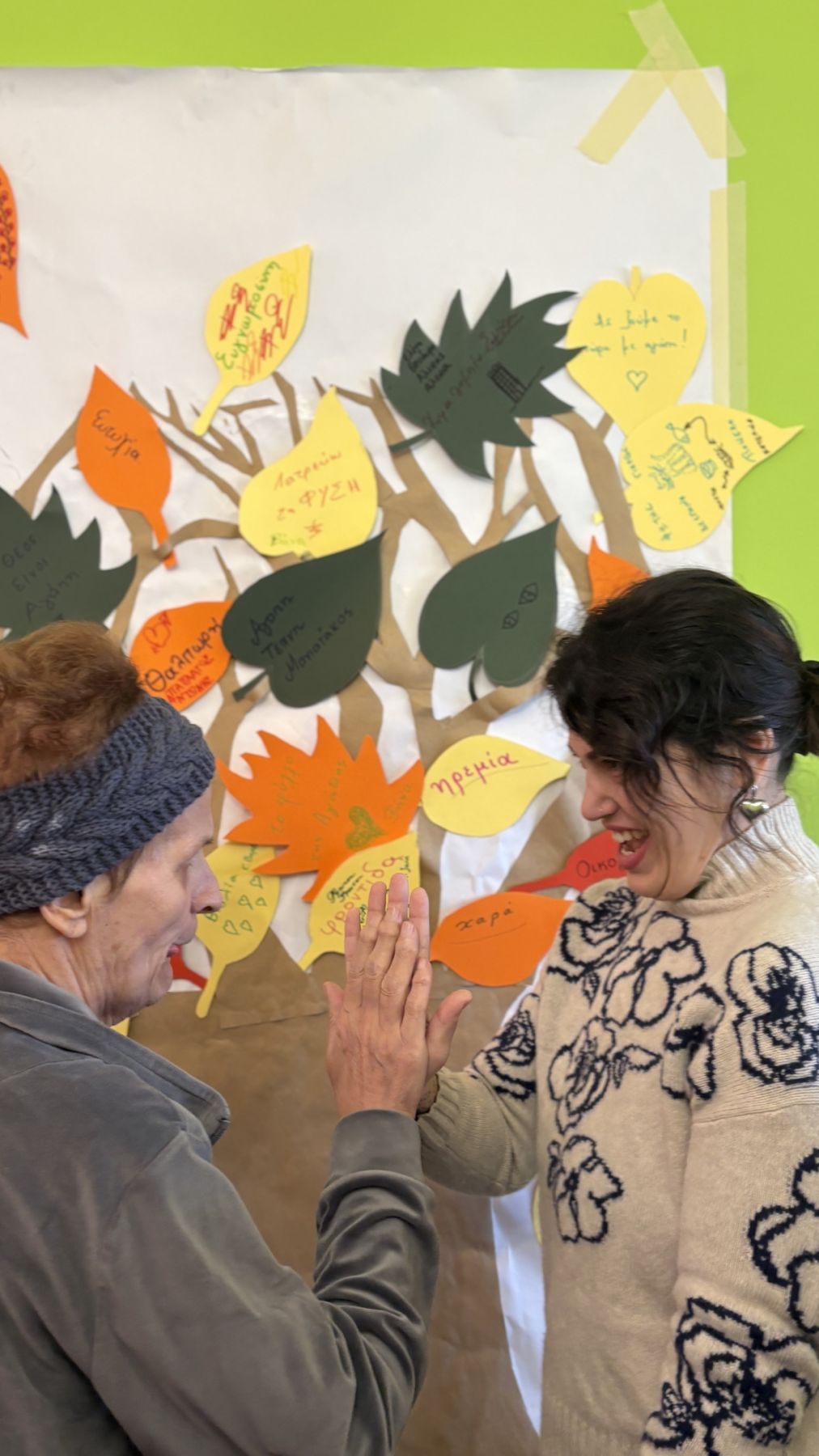 Με τη βοήθεια των φοιτητών, οι ένοικοι κλήθηκαν να γράψουν σε κάθε φύλλο λέξεις που τους εξέφραζαν ή τους έρχονταν αυθόρμητα στο μυαλό, όπως «αγάπη», «θαλπωρή», αλλά και πιο προσωπικές επιλογές τους όπως «σοκολάτα» και «μουσική». Στη συνέχεια, τα φύλλα τοποθετήθηκαν στο δέντρο, δημιουργώντας μια πολύχρωμη και συμβολική σύνθεση, γεμάτη συναισθήματα και αναμνήσεις.